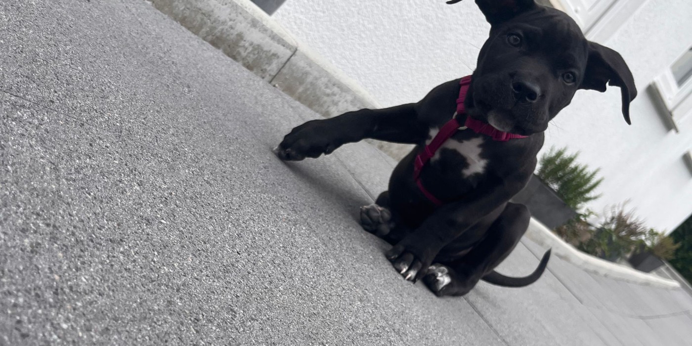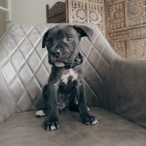 Braun / Schwarz mit weißen Flecken am Bauch und brust Grün graue Augen