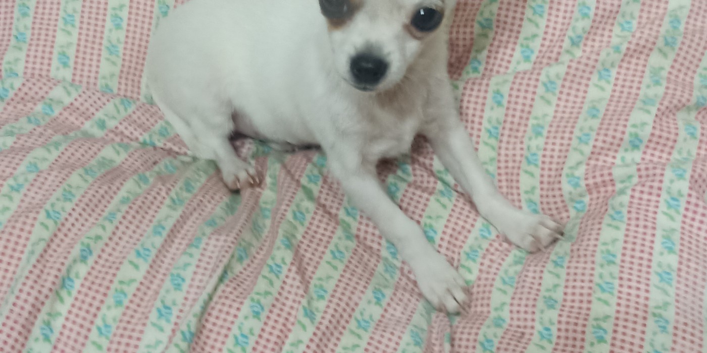 Chihuahua 3 meses , blanco con orejas bicolor marrones... 1,350 kg. Nació 9 mayo , tres meses +- .