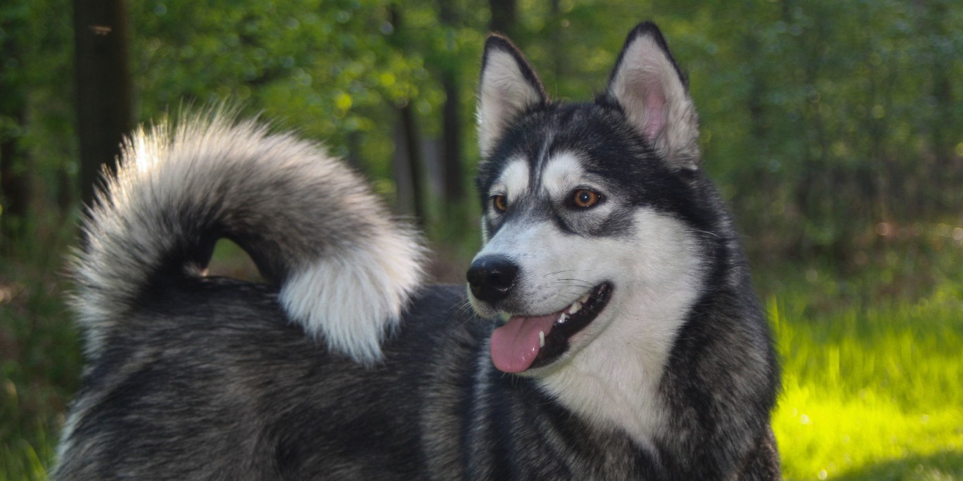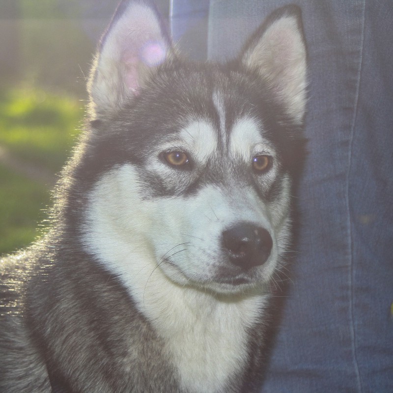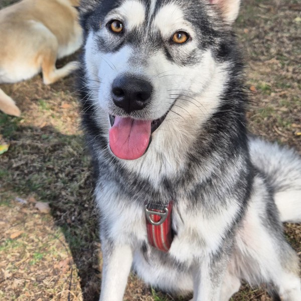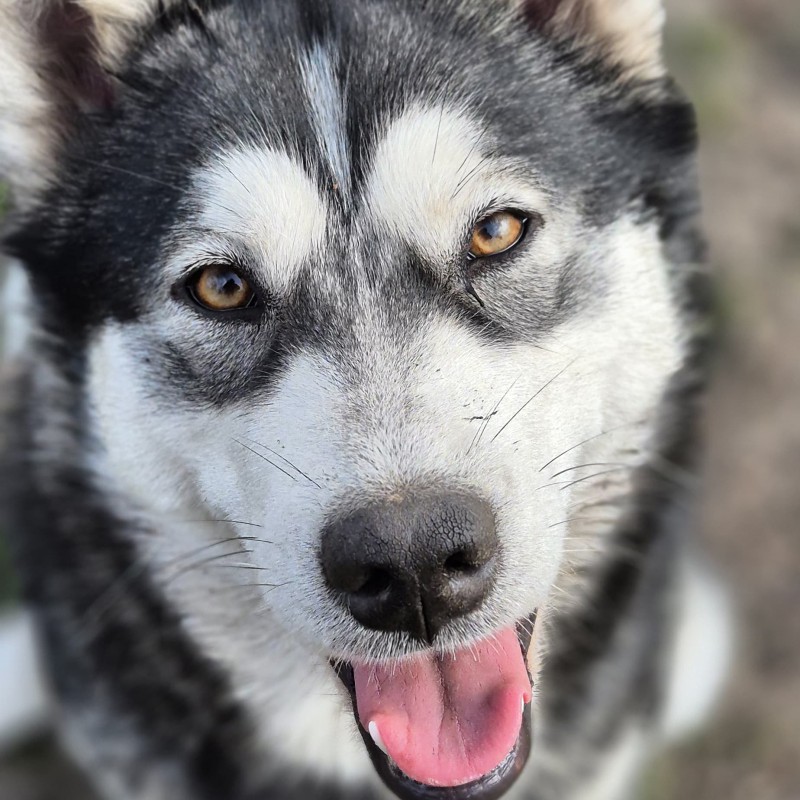 Zwart met witte kruising Alaskan Malamute/ Huskyteef.