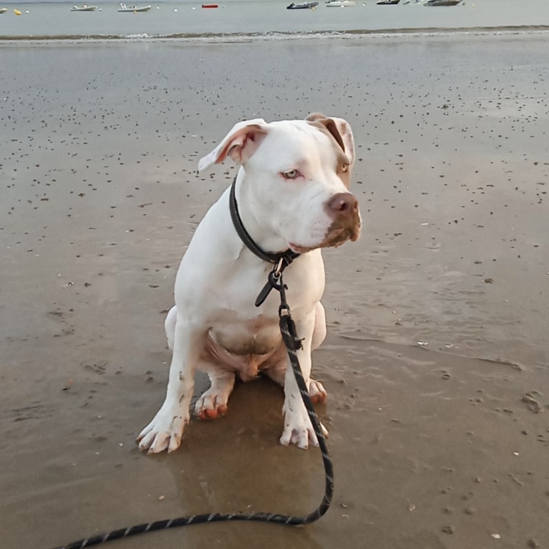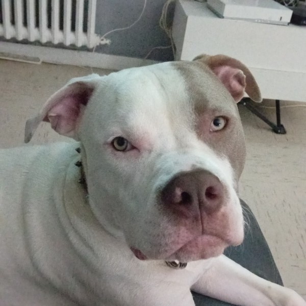 Bully xl blanc avec une tache marron oeil gaiche aux yeux bleus