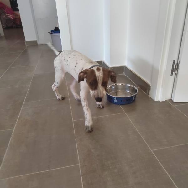 Perra mestiza, el padre es de raza Bretón y la madre american Bull terrier