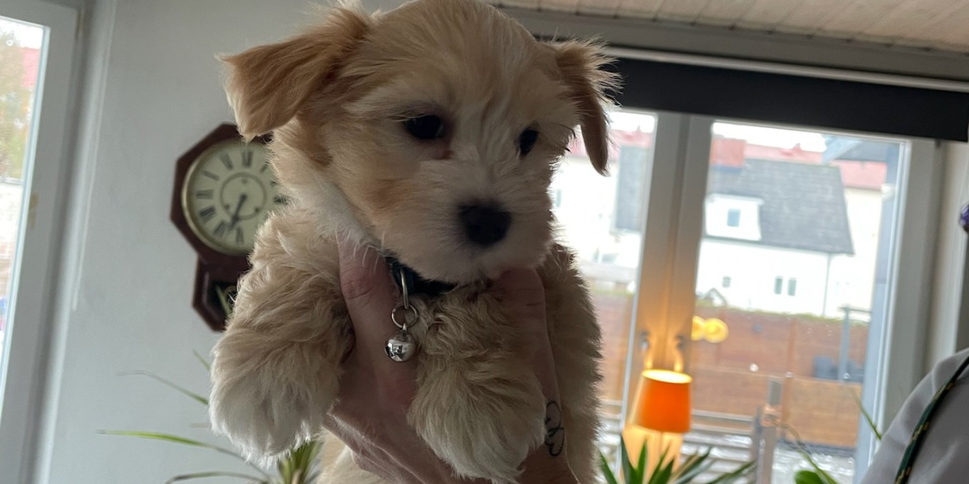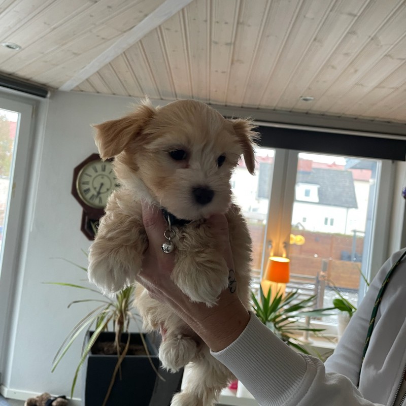 Beige med vita inslag, busig men även lugn gillar att gosa o har mycket spring i benen. Nyfiken p allert.