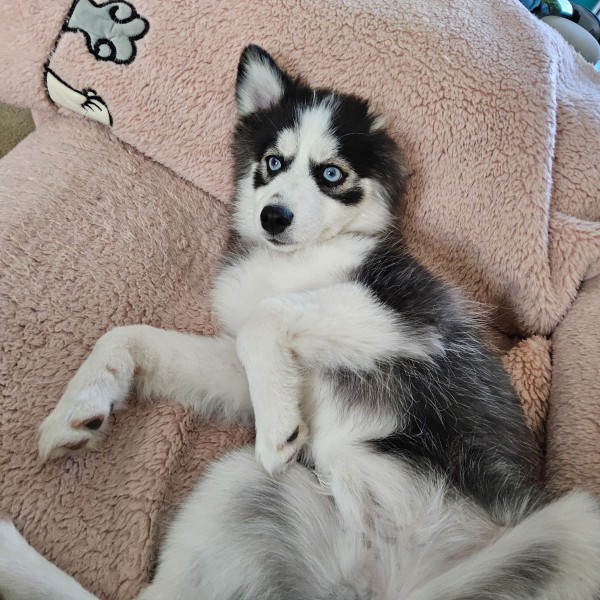 Pomsky jugueton y muy velociraptor